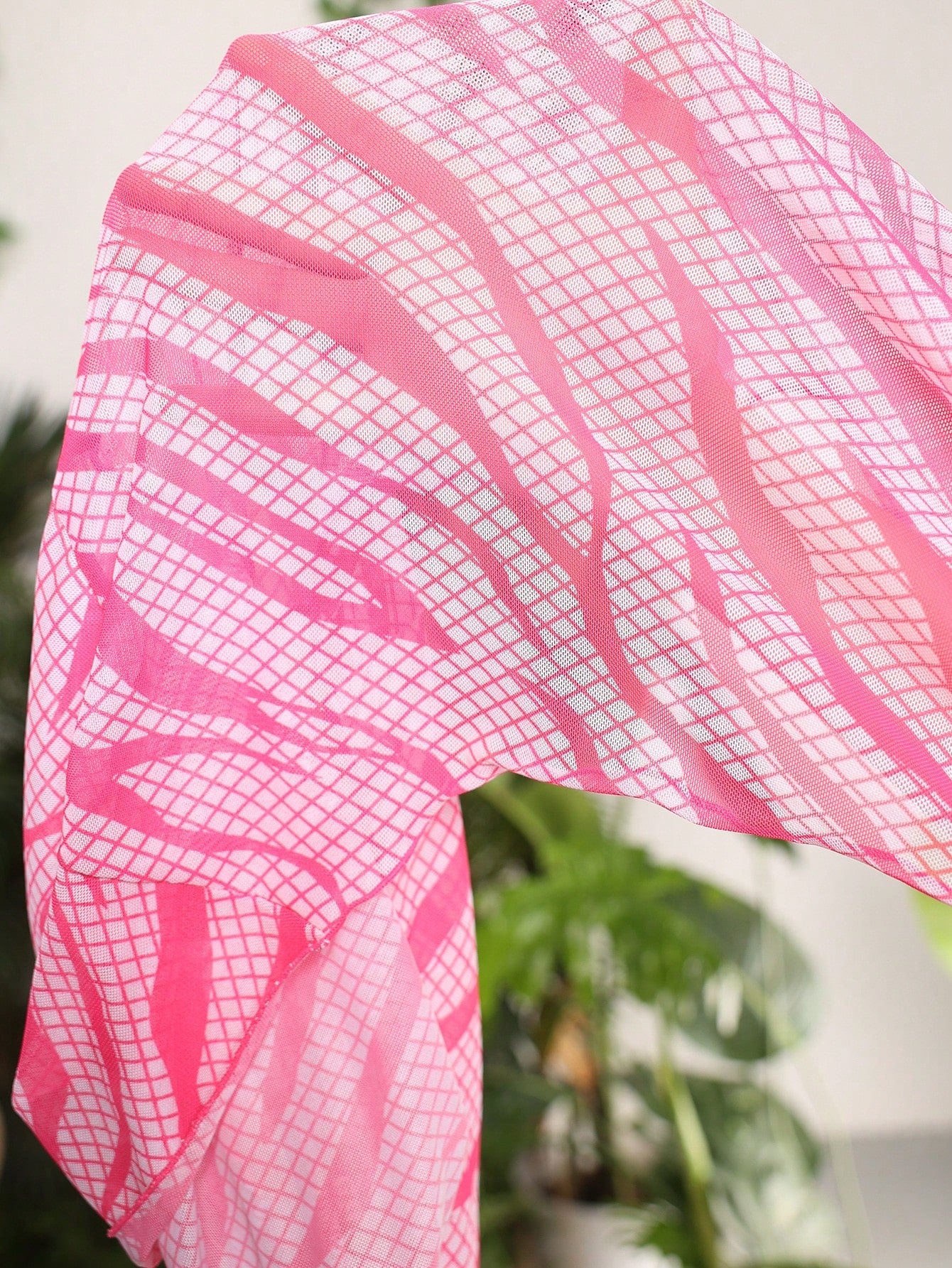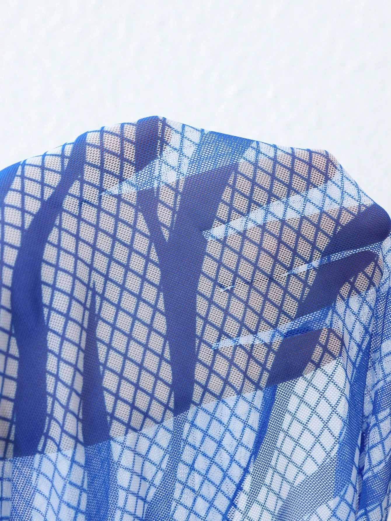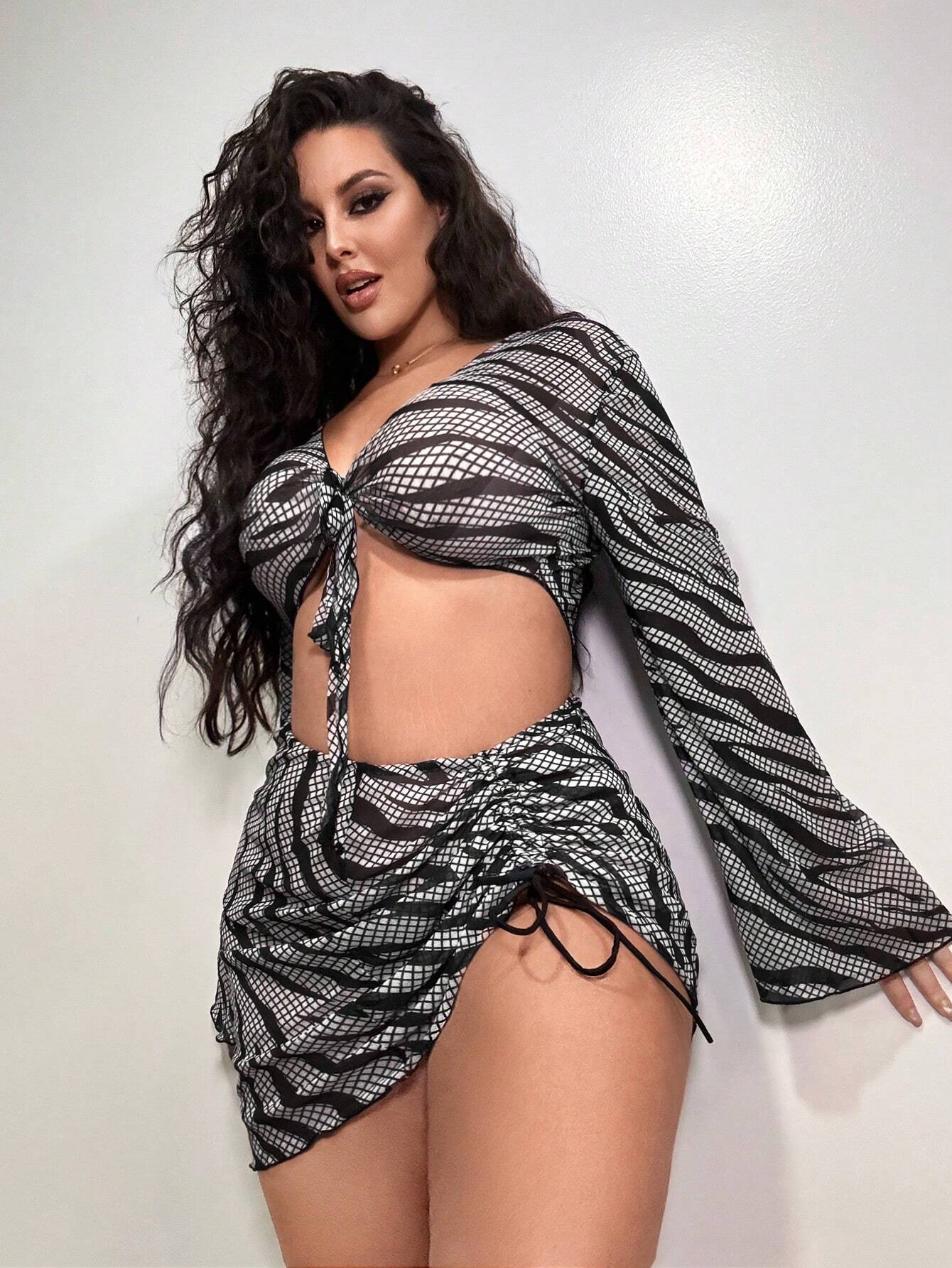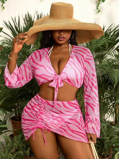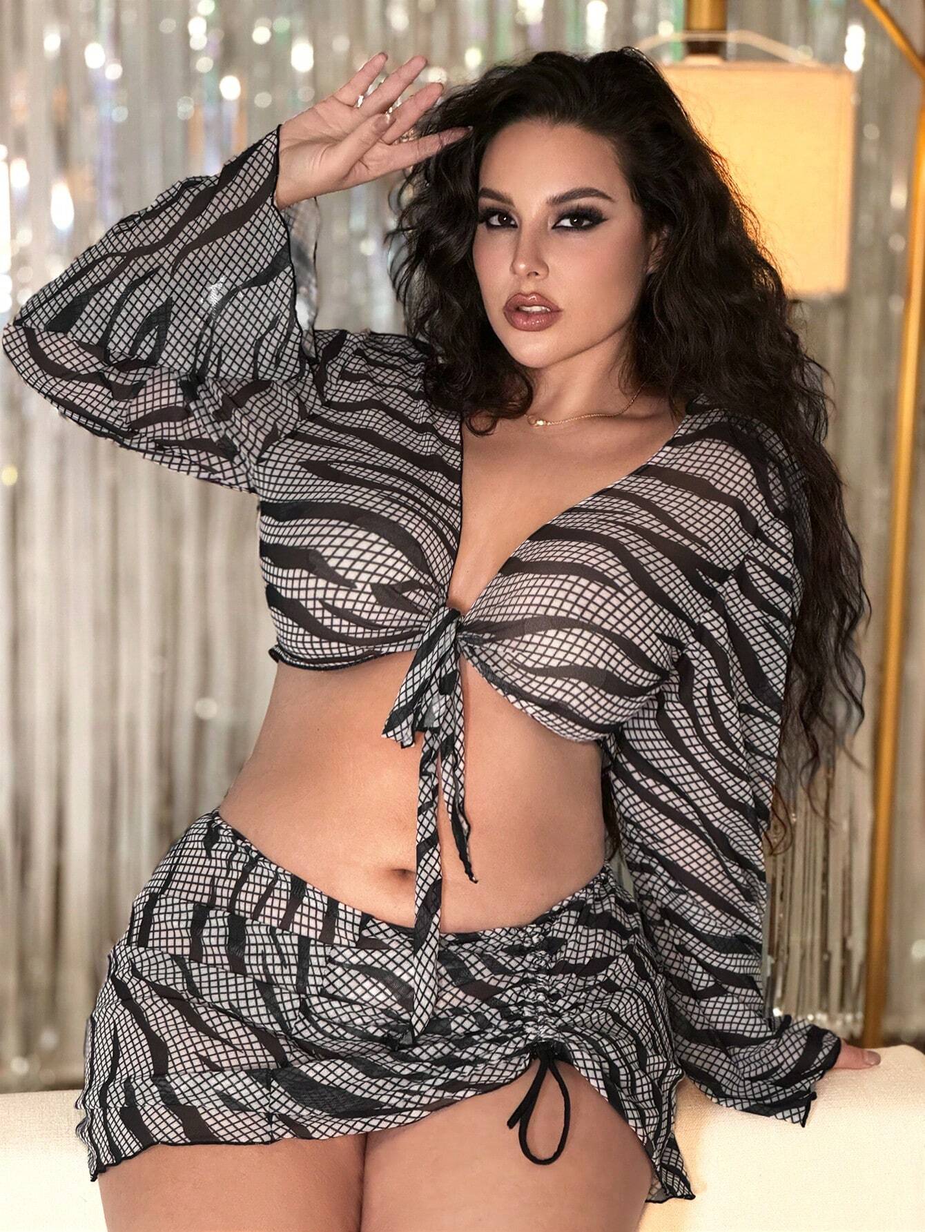 Slaysola Summer Beach Plus Size Geometric Printed Kimono & Cover Up Skirt, Long Sleeve Beach Outfit Vacay Vibe
