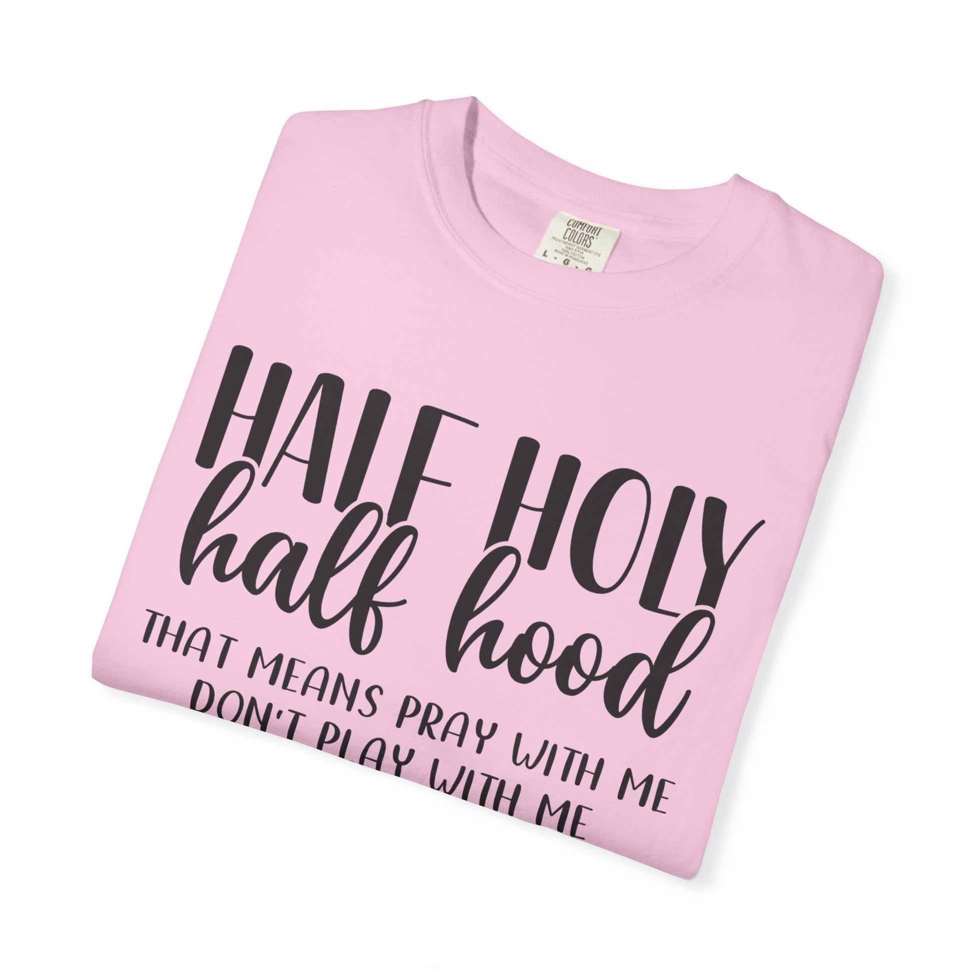 Unisex Garment-Dyed T-Shirt with "Half Holy Half Hood" Quote - Perfect for Faith and Fun, Great Gift for Birthdays and Casual Outings
