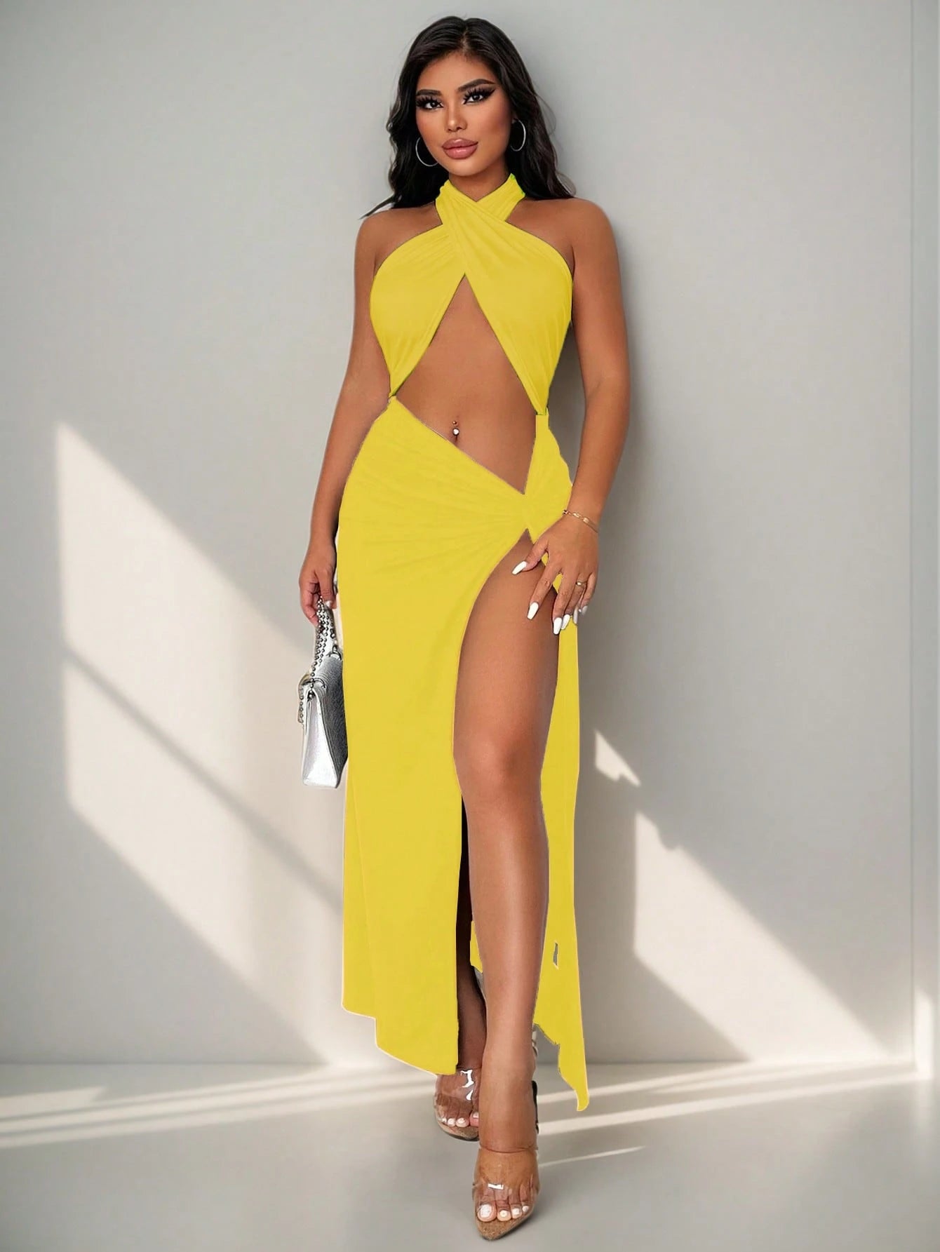 Zolique Cut Out Twist Front Halter Neck Backless Split Thigh Dress Maxi Women Outfit